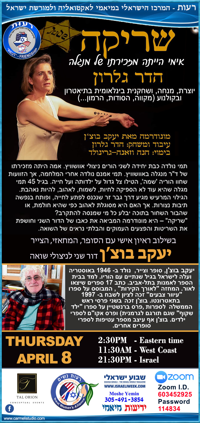 במידה ותתבקשו להכניס סיסמא: 114834 (Zoom I.D. 603-452-925)